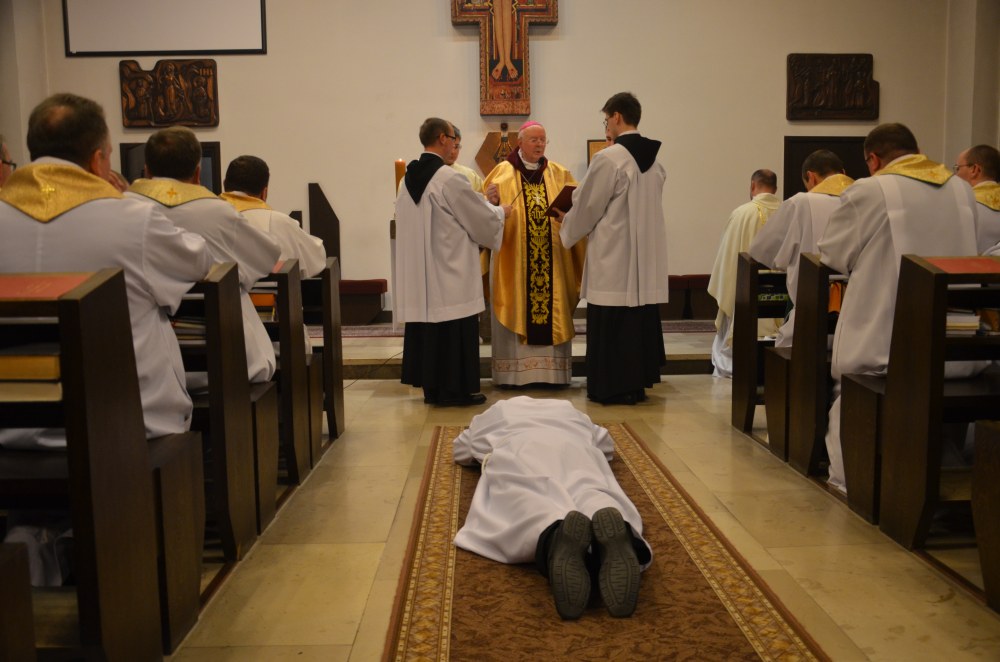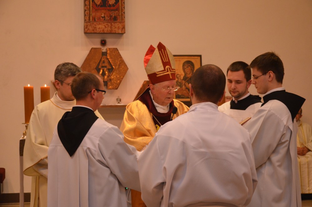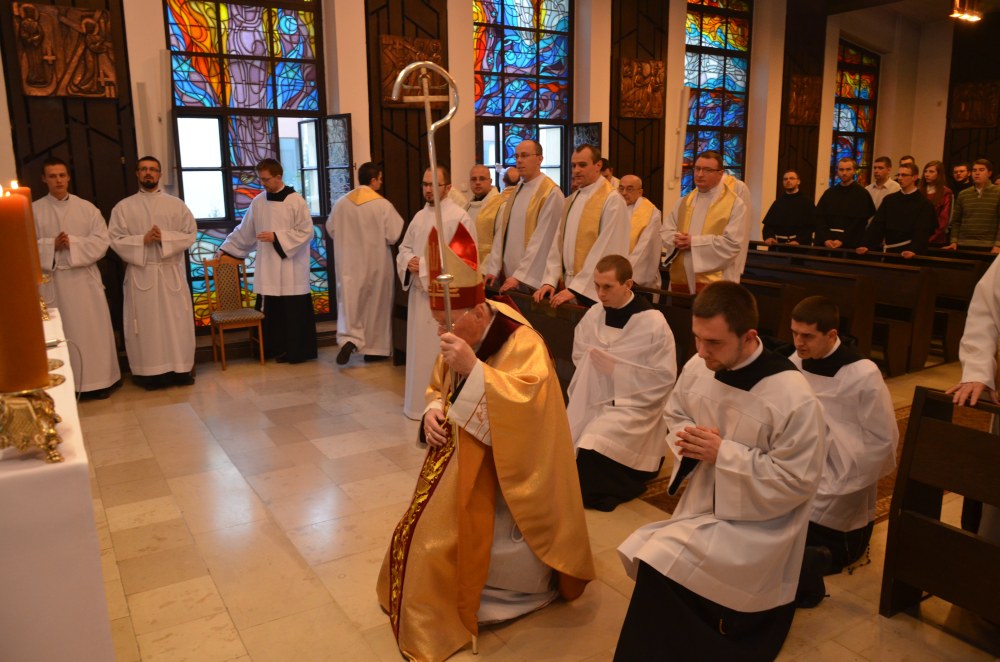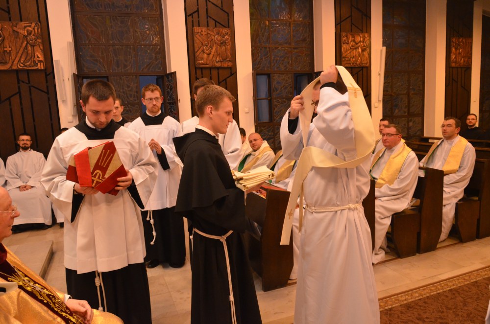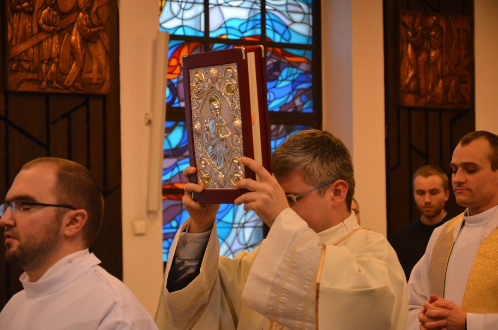 W dniu dzisiejszym, 10 III br., w naszym Seminarium miała miejsce podniosła uroczystość: br. Eugeniusz Hołub z rąk ks. abpa seniora Władysława Ziółka przyjął święcenia diakonatu. Zgromadziła ona przybyłą z Iwieńca na Białorusi, skąd pochodzi br. Eugeniusz, rodzinę, bliskich przyjaciół, a także współbraci z Polski i Białorusi. Wcześniej, podczas południowej Modlitwy z Liturgii Godzin, br. Eugeniusz złożył wyznanie wiary, które w imieniu Ojca Prowincjała przyjął Ojciec Rektor.