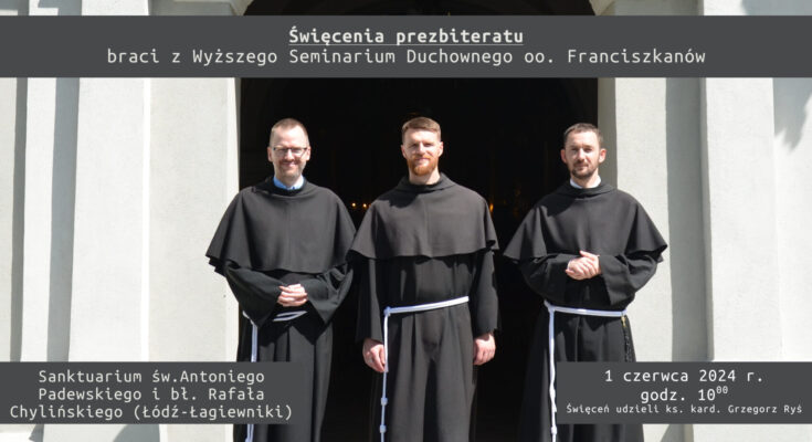 W sobotę 1.06.2024 o godzinie 10:00 w Sanktuarium świętego Antoniego w Łodzi-Łagiewnikach święcenia przyjmie trzech braci: o. dk Arkadiusz Burzec, o. dk Paweł Lubiński, o. dk Grzegorz Kmiecik z rąk Jego Ekscelencji Księdza Kardynała Grzegorza Rysia.